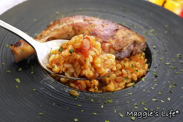 雖然菜單寫的是燉飯,不過端上來卻是米麵,因為外型確實也像米。店裡選用義大利進口的米型麵,搭配比較重口味的茄汁,米麵的口感很好,軟硬度適中,我們都蠻喜歡的。