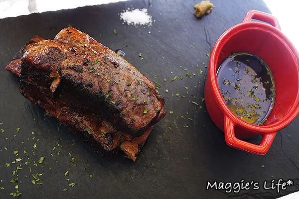 「帶骨牛小排」是店裡的推薦菜色,外型酷似台塑牛小排,搭配用蘋果調製的甜鹹醬汁,另外還附有法國海鹽和日本柚子胡椒醬做搭配。