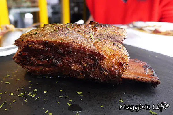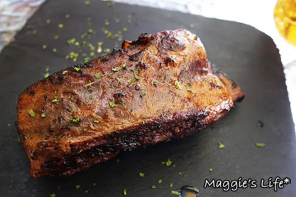 牛小排的份量頗大,切開來呈現一絲絲的肉質,和一般印象中比較有嚼勁的牛小排不同,細緻好咬是其特色,即便接近全熟的狀態也不會乾澀不好入口。