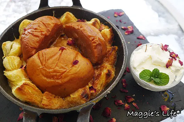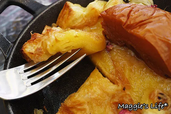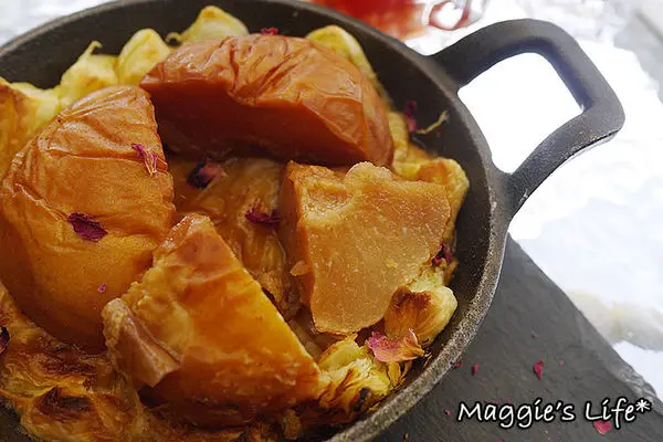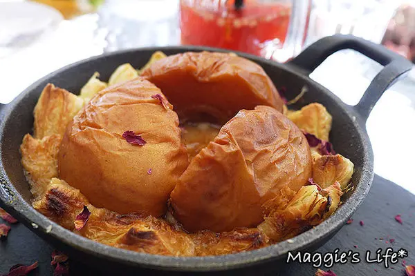 用慢火燉煮出來的焦糖水梨聞起來有些肉桂香味,特別的是底下的塔皮吃起來QQ軟軟的,比較有濕潤感,和一般偏酥的塔皮口感不同,而吃完這道甜點我也差不多飽了。