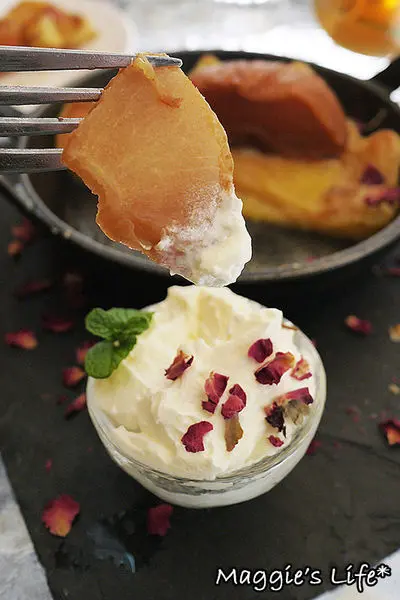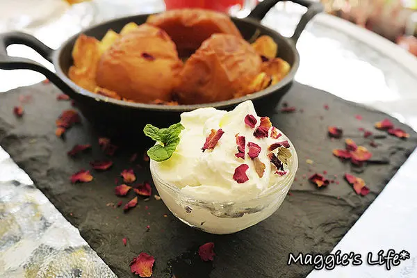 搭配卡地亞鮮奶油,整個盤飾加入花瓣看起來好美哦!