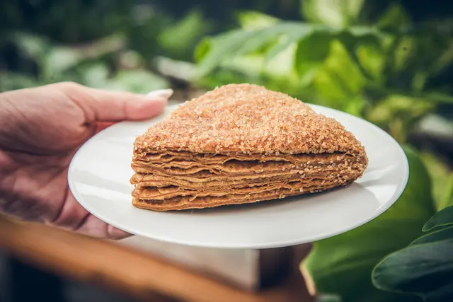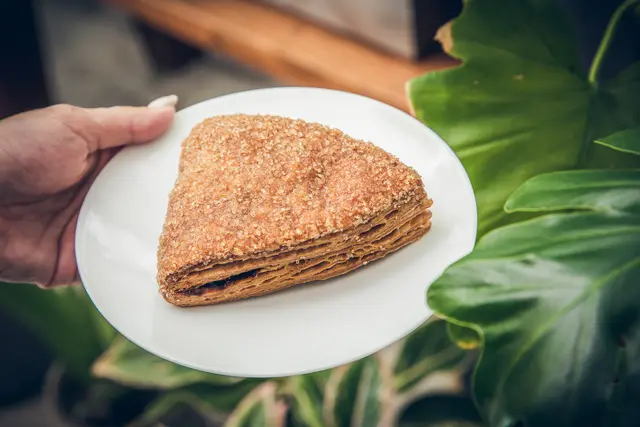 香草蘋果香頌,有別於一般蘋果派的長形外觀,承繼是做成三角形的,使用蘋果汁、蘋果皮、蘋果白蘭地、香草,並以72小時低溫熬煮成蘋果內餡,鮮奶油製成的派皮是比一般的千層派長四倍的時間去烤,帶有些許太妃糖的味道,搭配煙燻蕎麥的香氣,且撒滿顆粒結晶,外層酥脆有層次,裡面的內餡更是濃縮了蘋果的酸甜果香,也是不容小看得狠角色啊