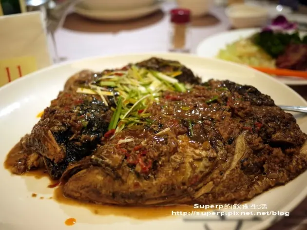 干燒大魚頭$1,200(看起來就很驚人,因為魚頭真的超大。魚頭的肉質細嫩,下巴跟魚臉頰的部分還很多肉,醬汁非常夠味,是個很下飯的料理。不過這道價格較高,而且怕有些人可能不太敢吃魚頭,所以點的人要斟酌)