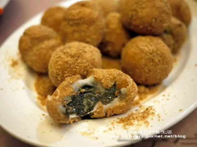 芝麻炸元宵(這道是店家招待的,也是我今天最喜歡的一道。芝麻元宵去炸過,沾上花生粉。一咬下去,裡面的芝麻餡就滿溢出來,跟吉品海鮮的流沙包有異曲同工之妙,只不過一個流出來的是鹹蛋奶黃餡,一個是芝麻餡。這超對我這個芝麻控的胃口,很想要包一些回去,特推!)