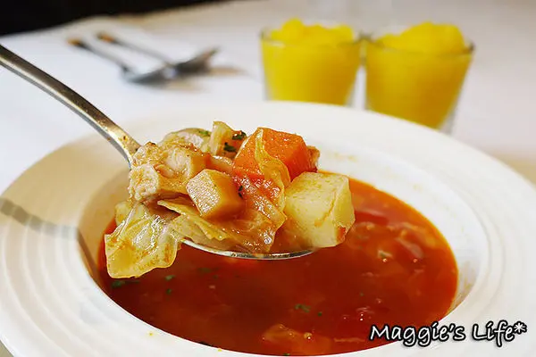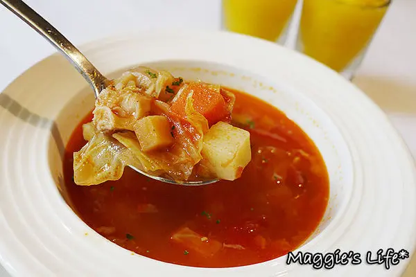 「蕃茄雞肉蔬菜湯」,另有南瓜濃湯可選,我選了比較清爽的蔬菜湯,裡面以蕃茄為基底,搭配紅蘿蔔和白菜、馬鈴薯和雞肉丁,喝起來沒有太濃的蕃茄味,屬於比較清淡的湯品,如果可以再多加點蕃茄的口感會更讓人喜歡。