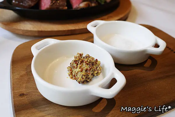 搭配的調味料有芥籽醬和鹽之花,二者加在鮮甜的牛肉上可變化出豐富的口感,不過這牛肉單吃已經有絕加風味,調味料我反而只試一下味道。