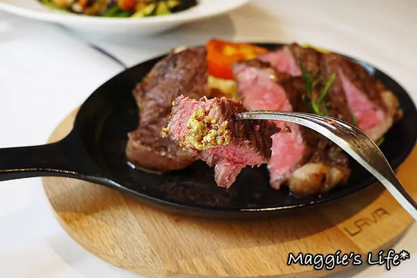 而這塊極黑牛肋眼心牛排的肉質入口後,在咀嚼的過程中不斷散發牛肉的甜味,富有嚼勁卻又帶著軟嫩口感,五分的熟度十分剛好。
