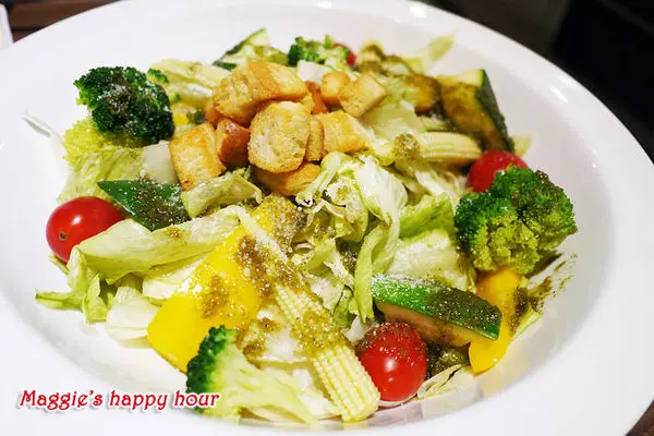 「綜合野菜洋風沙拉」裡面的食材很豐富,除了眼前大家看到的常出現的幾種食材外,還放了少見的花椰菜,滿滿的一盤營養的野菜,除此之外他們家的麵包丁很大顆,口感很棒!我喜歡!