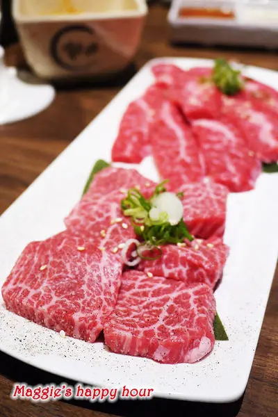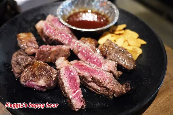 烤到五分熟的乾杯牛排也剪好小塊盛盤了,因為油脂豐富的關係,筋比較多,吃起來也就比前面那些牛肉需要多些咀嚼的時間,如果牙齒不太好的朋友,點和牛來吃會比較適合XDDD