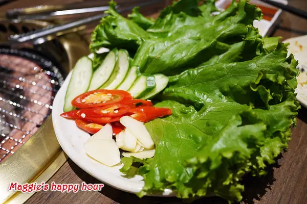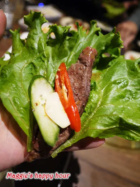 單吃已經讓人滿足,但也不可錯過用生菜包肉的吃法,不然生菜會不開心的!依自己想加什麼就加什麼的意志,我把烤好的和牛沾先韓國辣醬再吃,老實說多了外層的生菜,吃起來會少了油膩感,呈現比較清爽的口感,但無論單吃還是包生菜吃我覺得都不錯!