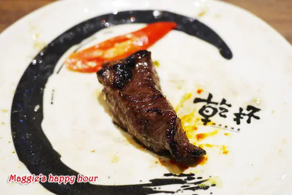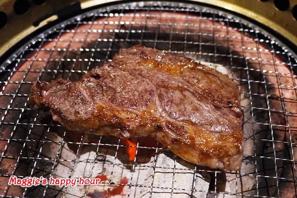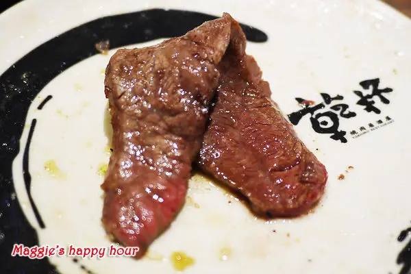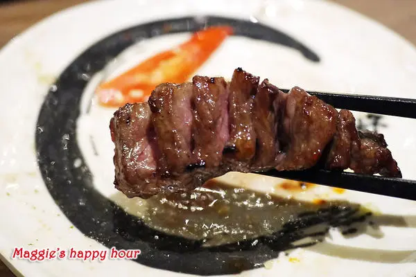 和牛烤好約五分熟吃起來較嫩又帶點嚼勁,經過烤爐逼出油脂,外表呈現油亮亮的樣子,送入嘴裡慢慢咬出甜味,肉質相當不錯。