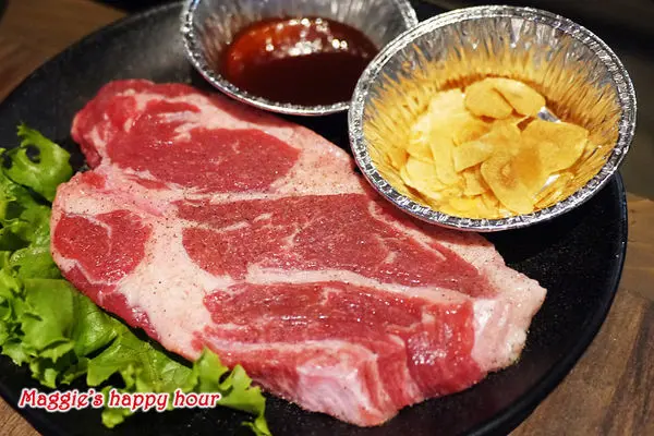 「乾杯牛排」來乾杯沒點它好像怪怪的!看起來頗有厚度的牛排肥瘦參半,附上蒜片和牛排醬,等等烤好才要見真章。