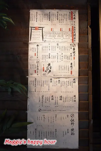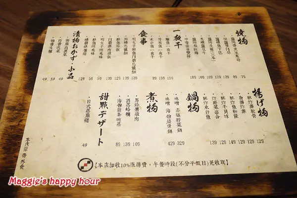 每個桌上也擺放了紅色鳥居的告示牌,上面寫著最新的活動消息,凡晚餐時段前來消費,打卡就送「鹽燒魴柴燒」,還有其他滿額加購的優惠活動。