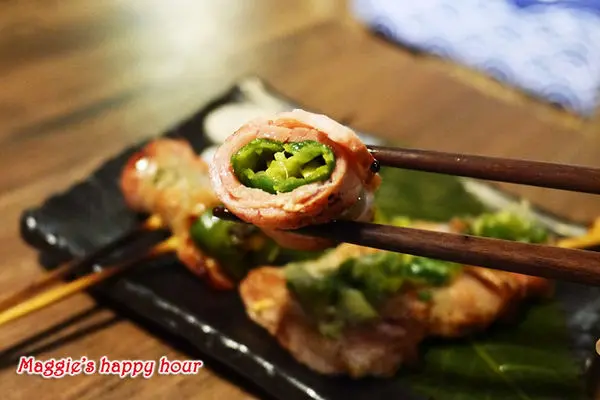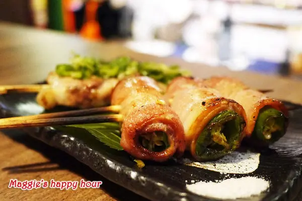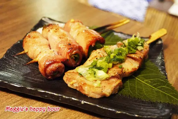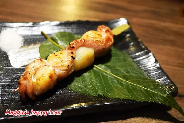 「培根腰貝浪捲」培根和干貝糾纏在一起了,二者你濃我濃不願分開,被串在一起,算是海陸雙拼的串燒組合,干貝很有彈性,加上培根原有的鹹味,不必加什麼調味就很好吃了。