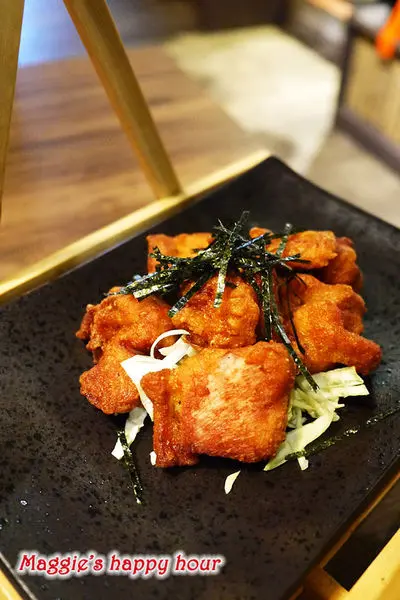 「唐揚炸雞」用一座木橋來裝飾呢!我太喜歡這個創意了,這讓原本平凡的唐揚炸雞,身價立馬翻倍,水漲船高。特別的是店裡的唐揚炸雞獨排眾意,硬是搭配了梅子醬、大阪燒醬和照燒醬三種口味,十分特別。