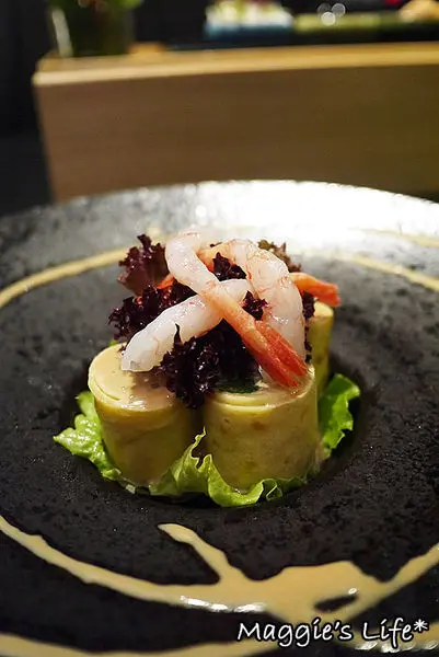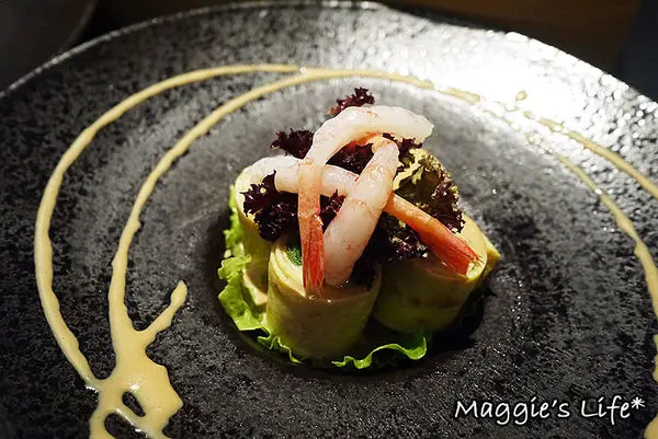 「甜蝦時蔬捲」底下是以玉子燒捲起切塊,上面舖上生菜和三尾交疊的甜蝦,佐上香濃胡麻醬,讓這道沙拉有著濃、香、鮮的多層次豐富口感,我很喜歡。