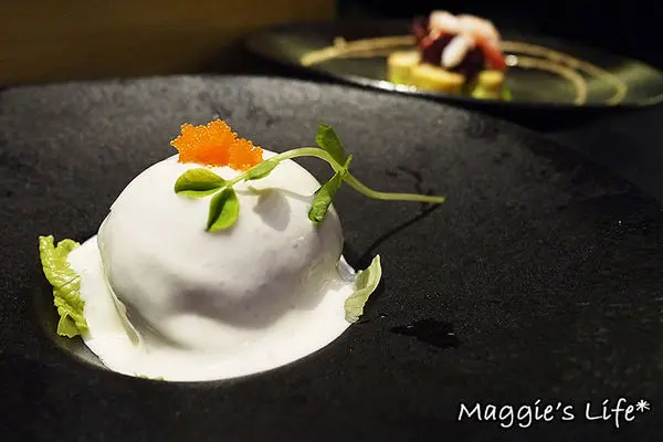 「燻鮭魚蕃茄沙拉」送上來就像一顆香草冰淇淋大球,上面用明太子裝飾,讓人和菜名聯想不起來,還以為是什麼驚喜!