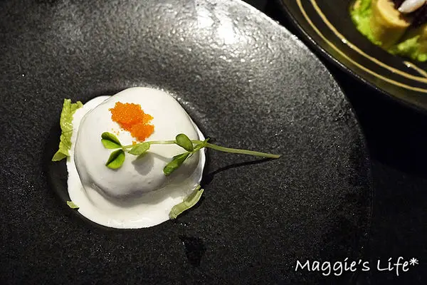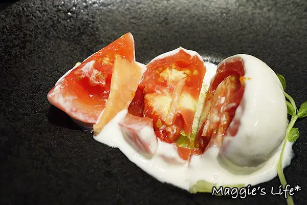 撥開一看原來裡面是整顆新鮮蕃茄,切段後夾入煙燻鮭魚片,最後整回完來的整棵蕃茄形狀後,外層淋上主廚特調的白玉優格醬,帶著微微的酸甜口感,但又咬到蕃茄的鮮度,不過相對煙燻鮭魚的味道就被埋没了,白玉優格醬太搶戲了!XDDD
