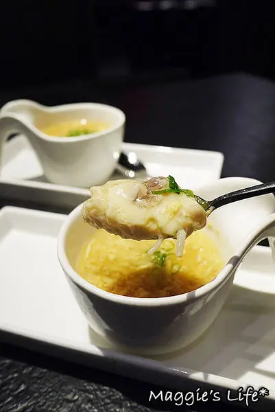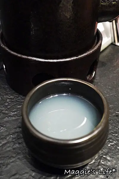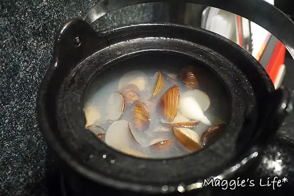 掀開蓋一看裡面滿是黃金蜆,我看至少有30顆左右,和蒜頭一起煮,充滿鮮味,第一口喝下去口中滿是鮮香,好喝到無以覆加,一定要用這麼激烈的詞來形容XDD,實在太太太好喝啦!簡直都可以當茶來喝!後來是真的以湯代茶,完全冷落香香的玄米茶了,後來服務人員中途來加湯,我簡直喜出望外,原本我以為喝完就沒了,沒想到可以加湯,湯汁加入後味道還是很濃,完全沒有變淡,是精華中的精華,難得我可以用那麼多文字來讚美一碗湯,它實在很了得!!!