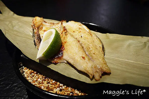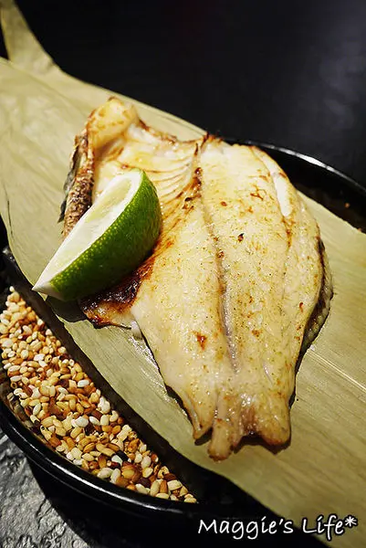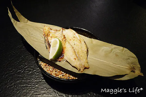 「鱸魚一夜干」用粽葉舖在下面,底下還有高溫的岩板持續在受熱