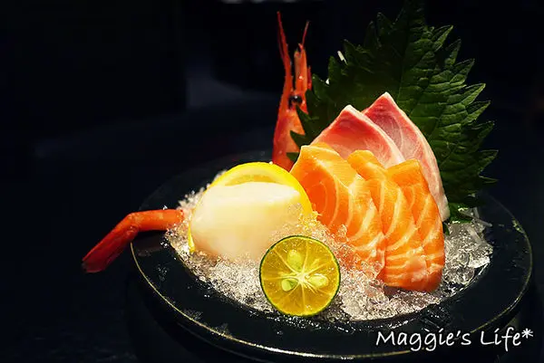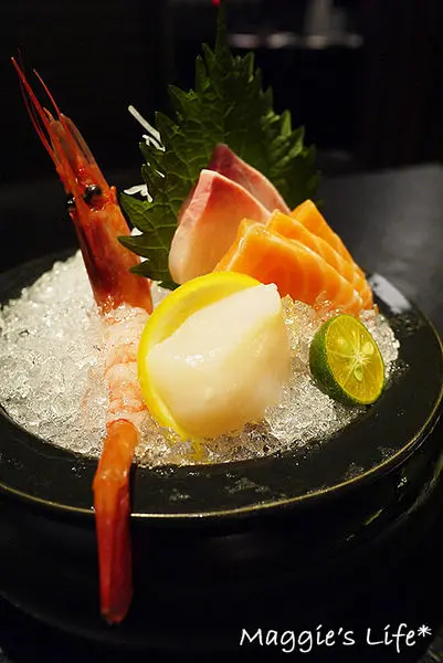 「刺身盛合」裡面有干貝、甜蝦、鮭魚和海鱺魚四種海鮮組合。