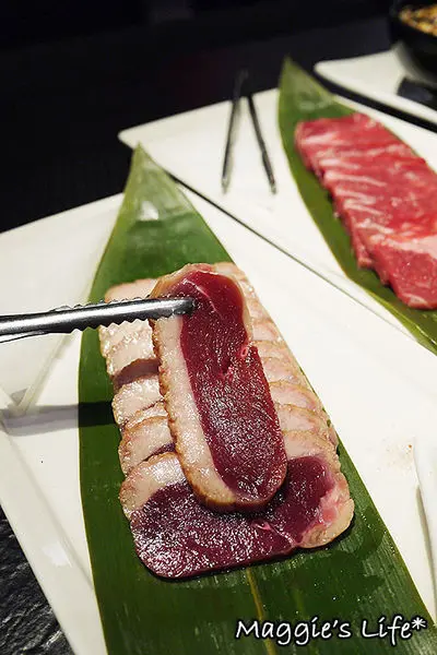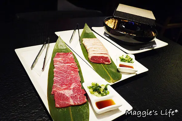 舖上一層烤肉專用的紙,避免岩板和肉直接接觸會沾黏,接著服務人員教我們怎麼烤,牛肉放上去後等上層血水漸漸浮上來就表示熟度差不多,可以翻面再烤上15-20秒,肉質約5-7分熟比較好吃!
