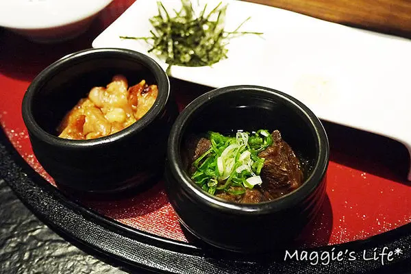 這四味小品食用順序由左到右,分別有海藻醋物,以新鮮清脆的海藻搭配洋蔥絲,拌上柚子醋,清爽開胃。