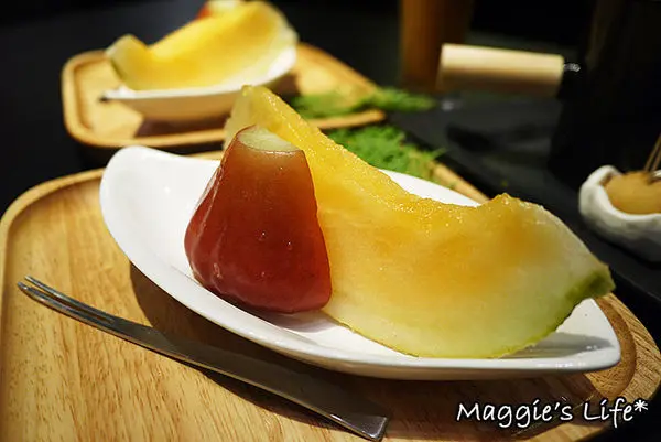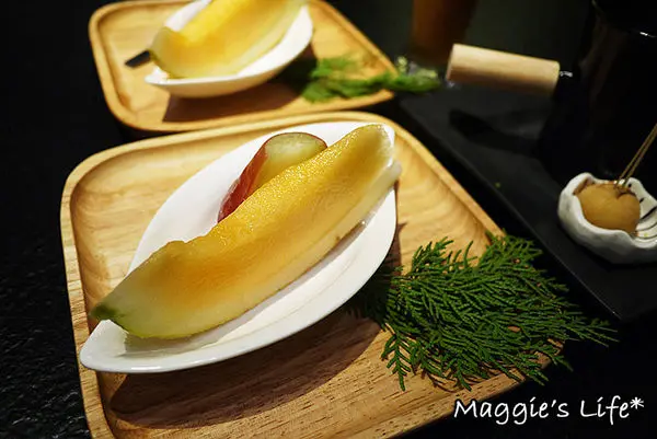 二種水果都好吃,尤其是哈蜜瓜清甜,切好也讓我們好入口,而且有扁柏裝飾很有質感。