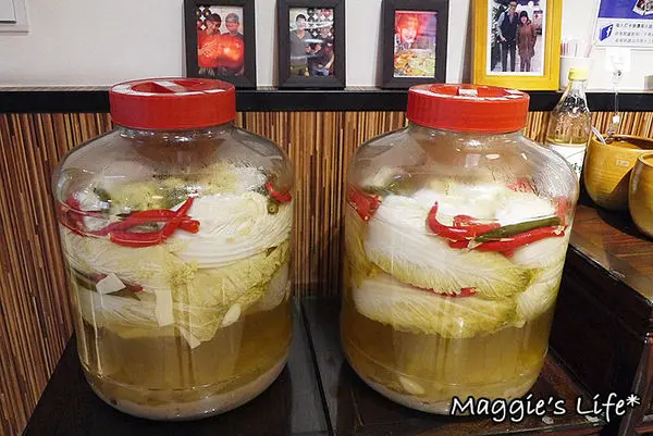 店門口就放這二大自製酸菜,將新鮮大白菜浸入高粱酒,再獨家增添辣椒、蒜頭、老滷汁等川味辛香料,最後再進行天然發酵與風乾,好吃的酸菜白肉鍋都要靠這一味哩!