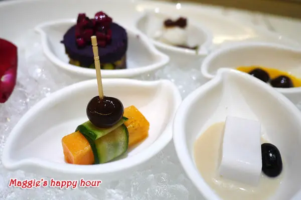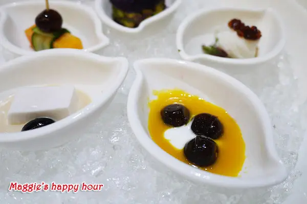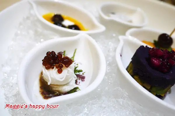 接著就是好菜一一上桌啦!先介紹「初韻套餐」880+10%服務費,一開始的「初韻典藏臻品」用一大盆碎冰塊,裡面再以小磁碟裝著精緻的菜餚,每一道都像是藝術品般的,先讓人大飽眼福,才剛開始就那麼膨派,更讓人期待後面的美食了。