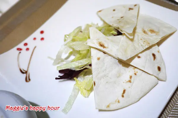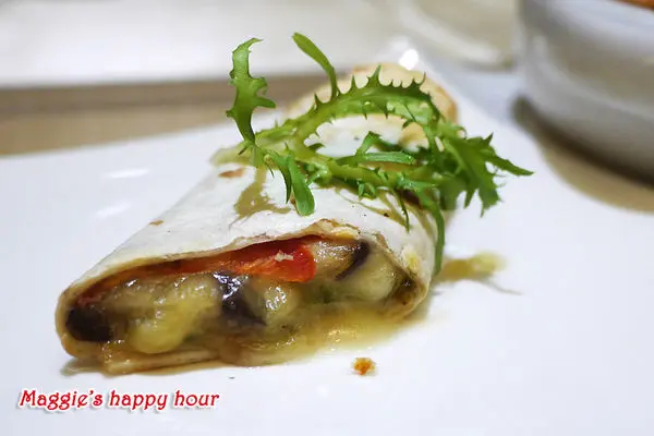 而這道焗烤勃根地蘋婆搭配一捲蔬食捲餅,裡面包著菇類和紅黃椒及蕃茄等蔬食,外層用手工桿製的餅皮包著即美味又營養。