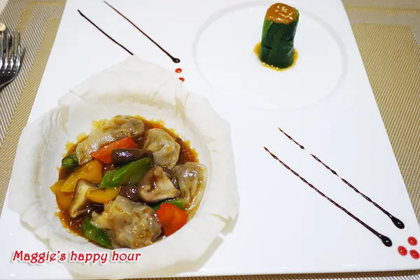 「紅油雲吞搭和風菠凌」這道頗有辣度,風味有像吃麻辣鍋的口感,雲吞裡包得是紅蘿蔔大豆和豆薯,加入了黃瓜、紅黃椒、香菇一起炒香,香氣和滋味都很好。