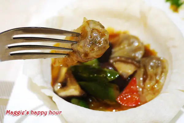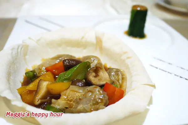 「焗烤勃根地蘋婆」這一道送上來時像是西餐常見的焗烤田螺,但裡面放的卻是俗稱「鳯眼果」的蘋婆,是一種營養價值高的植物,吃起來的口感很像栗子,加上了覆蓋在上層的香濃起司,口感不輸田螺呢!