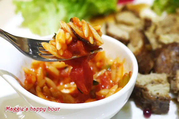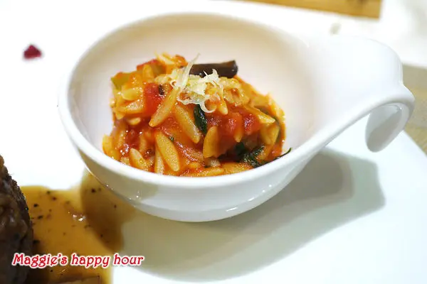 另外整份主菜還有一小碗的普羅旺斯米型麵,這米型麵我在希臘第一次吃到,因此看到它再度出現在我眼前時特別的親切,它雖然看起來像比較大顆的米粒,但吃起來就像是麵的口感,加上了主廚以南法料理的風味處理,整個醬汁融入在麵裡,風味不賴!