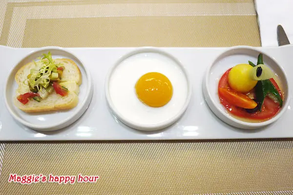 另一套「香蔓套餐」,580+10%服務費,第一道上菜的是「香蔓精緻臻品」,長型磁盤裡放了三種不同風味的菜色,有手工麵包佐綜合蔬果、芒果優格分子料理、綜合蔬果塔。