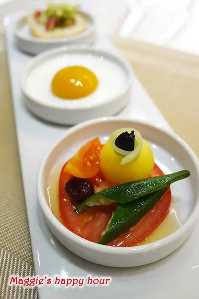 綜合蔬果塔則以蕃茄、秋葵、香瓜做組合,是一道兼具美味、清爽又好看的美食。