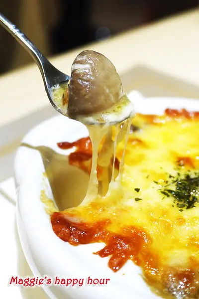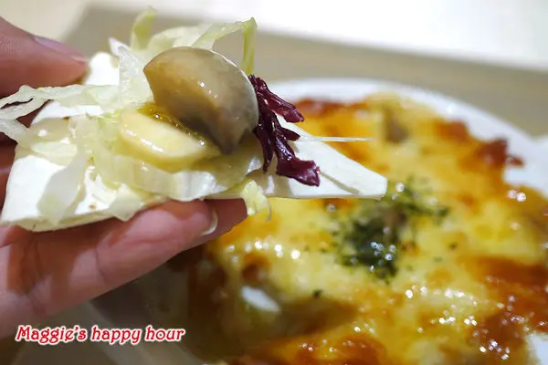 牽絲的焗烤起司裡面放得是洋菇,除了可以單吃外,還可以搭配生菜和手工薄餅一起吃,二者風味各有千秋。