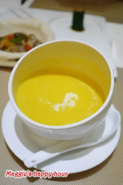「南瓜鮮蔬濃湯」喝得到南瓜本身的甜味,喝起來略有沙沙的口感,口感香濃。