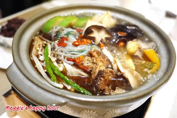 裡面的料像是蒟蒻絲、玉米荀、香菇、杏鮑菇、金針菇、黑木耳、絲瓜、南瓜、蘆筍、豆腐和芋頭等,在加入枸杞等中藥材精燉出濃郁湯品,除了新鮮的蔬果外,這藥膳湯真的很好喝,後來我們喝得不過癮還加了湯,非常推薦這道清爽豐富的藥膳鍋。
