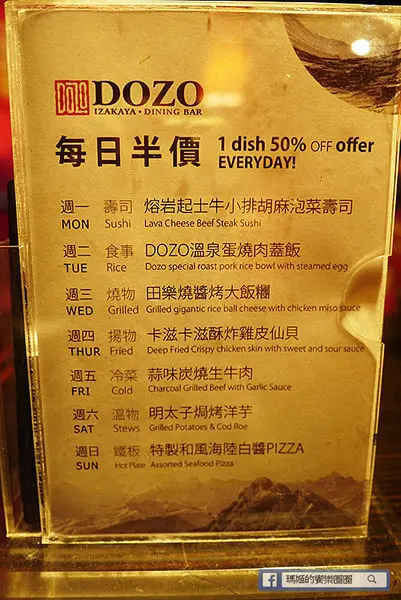店裡每天都有一道菜半價的優惠,看你哪一天就能有優惠,詳細菜單請點入參考→粉絲團