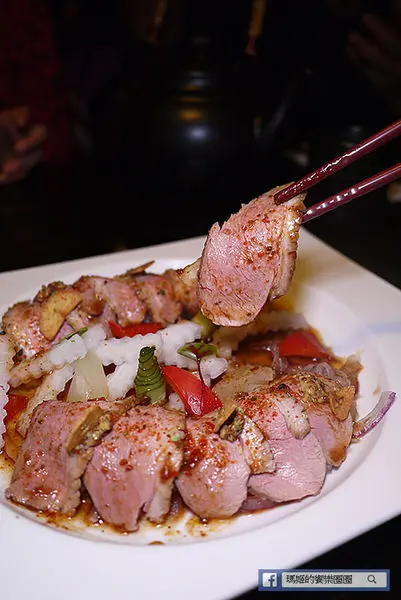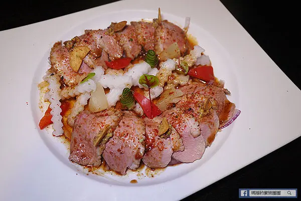 「麻香梅汁嫩鴨」280元,這是一道很讓人分泌口水的料理,主廚展現刀功將薄嫩的鴨肉刀刀落下,在搭配山藥、小黃瓜片、紅椒和洋蔥絲等蔬食,排列成一道「美食」即好看又好吃!