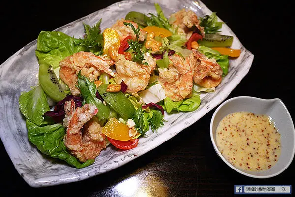 「黃金海老沙拉」320元,這份量來說並不會太少,旁邊附有芥末籽醬,以大量新鮮蔬菜和當令水果,在搭配好幾尾大蝦,又是一道讓人食指大動的料理