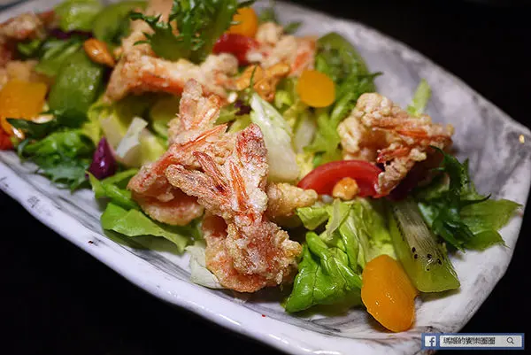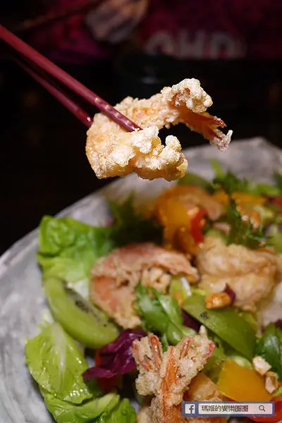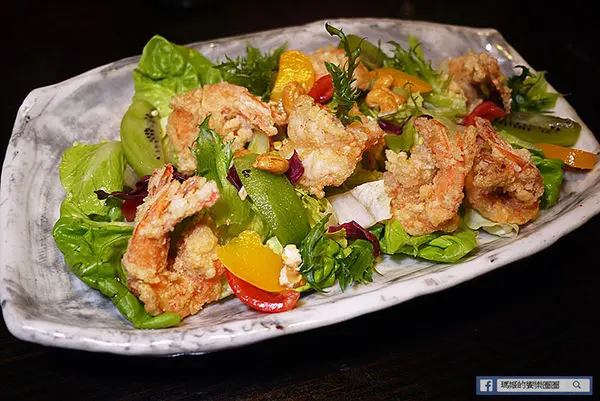 炸得金黃色的大蝦以貼心去殼,裹上薄薄的麵衣油炸卻不油膩,吃得到蝦肉的甜味,再搭配一點新鮮蔬果增加清爽,這道很推薦