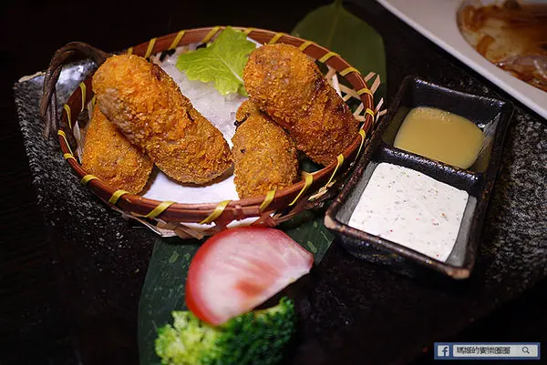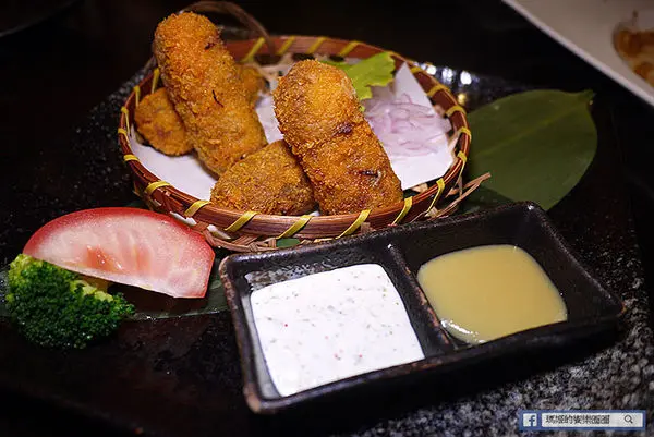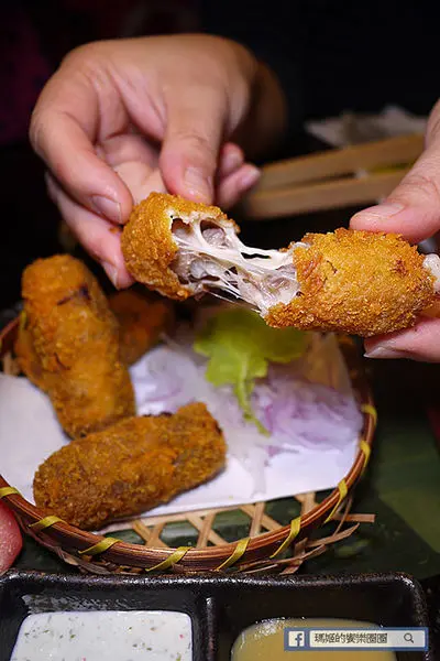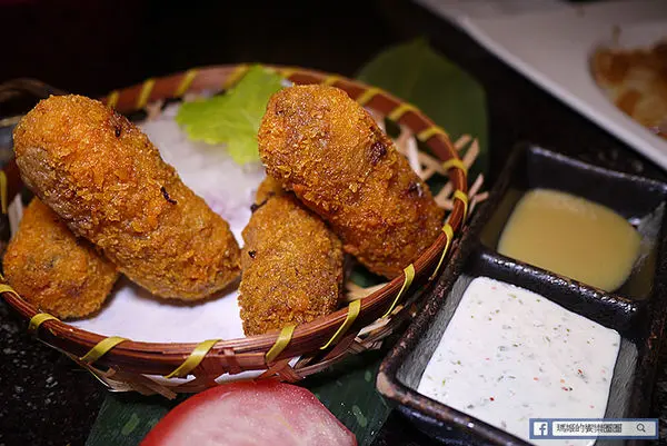 「牛小排馬芝拉起士捲」280 元,附塔塔醬和味噌醬,屋酒屋裡少不了這樣的創意炸物