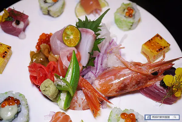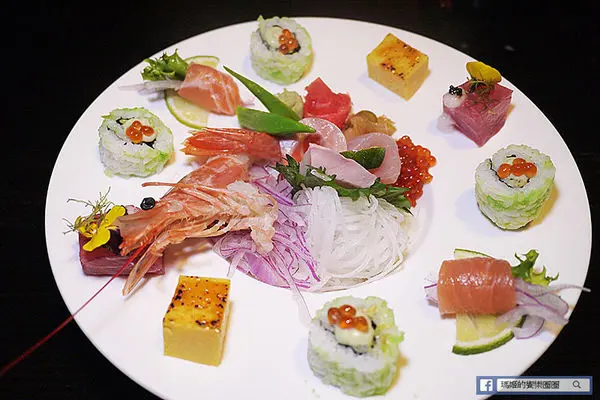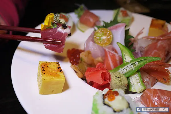 外層一圈用花壽司和玉子燒裝飾,裡面也以鮪魚、旗魚和鮭魚為主去搭配這道料理的特色