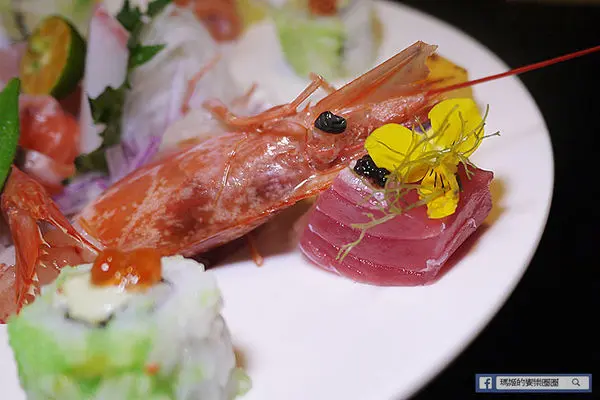 中間是以散壽司的方式來呈現,超大尾的牡丹蝦、生魚片和鮭魚卵,底下則是醋飯,吃完上面的好料外,再拌開來吃,多增加一點飽足感