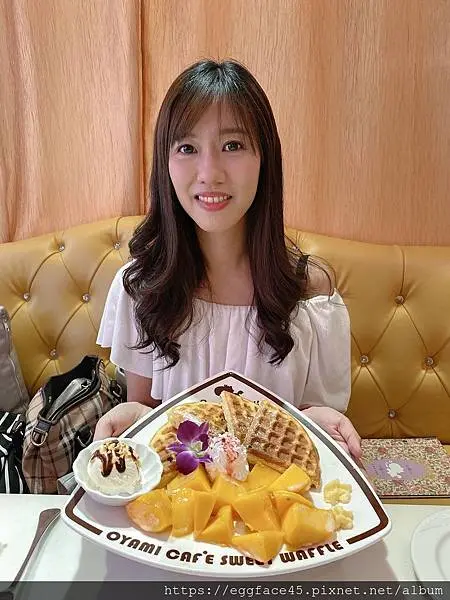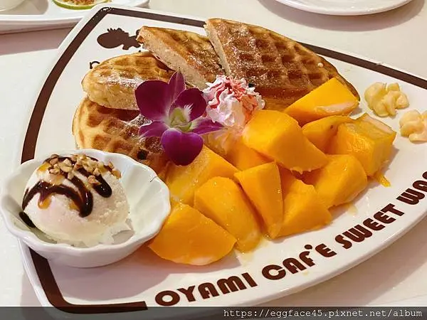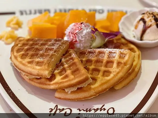 ▼新鮮芒果、香草冰淇淋,搭配香、鬆、軟的格子鬆餅,