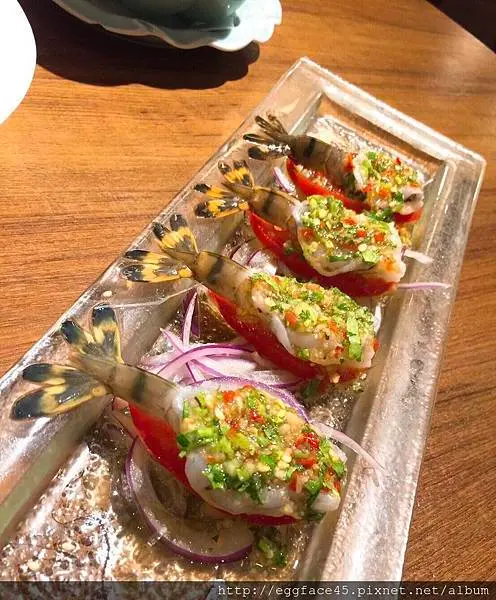 對切的生蝦,上面鋪滿了酸辣醬料,