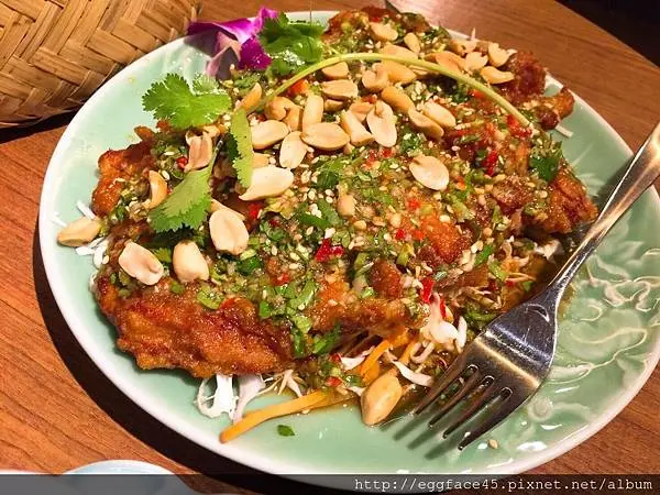 炸至酥香的雞肉,淋上了泰式椒麻醬汁,