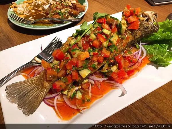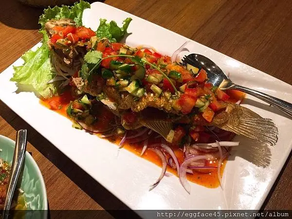 炸的香酥的鱸魚,浸泡在泰式醬料湯汁裡,